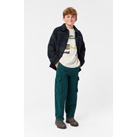 Gröna bomullsbyxor med sidofickor, två bakfickor med dolda tryckknappar och en ficka på varje lår. Byxorna har en lös passform och midjan kan justeras med ett invändigt gummiband, vilket säkrar en perfekt passform för alla barn. Storlekarna 92-134 har tryckknappar, vilket gör det enkelt att ta av och på byxorna, medan storlekarna 140-176 har en vanlig jeansknapp.