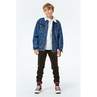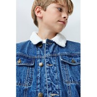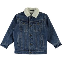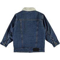 Hen är en blå jeansjacka med knappar och vitt innefoder som gör jackan mjuk och varm. Jackan har fickor på sidorna.
