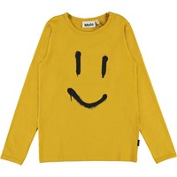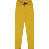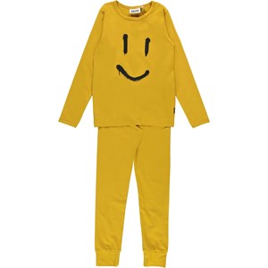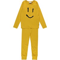Tvådelat senapsgult pyjamaset med smiley på tröjan. Byxorna har knytband i midjan och tröjan har långa ärmar. Bakgrund