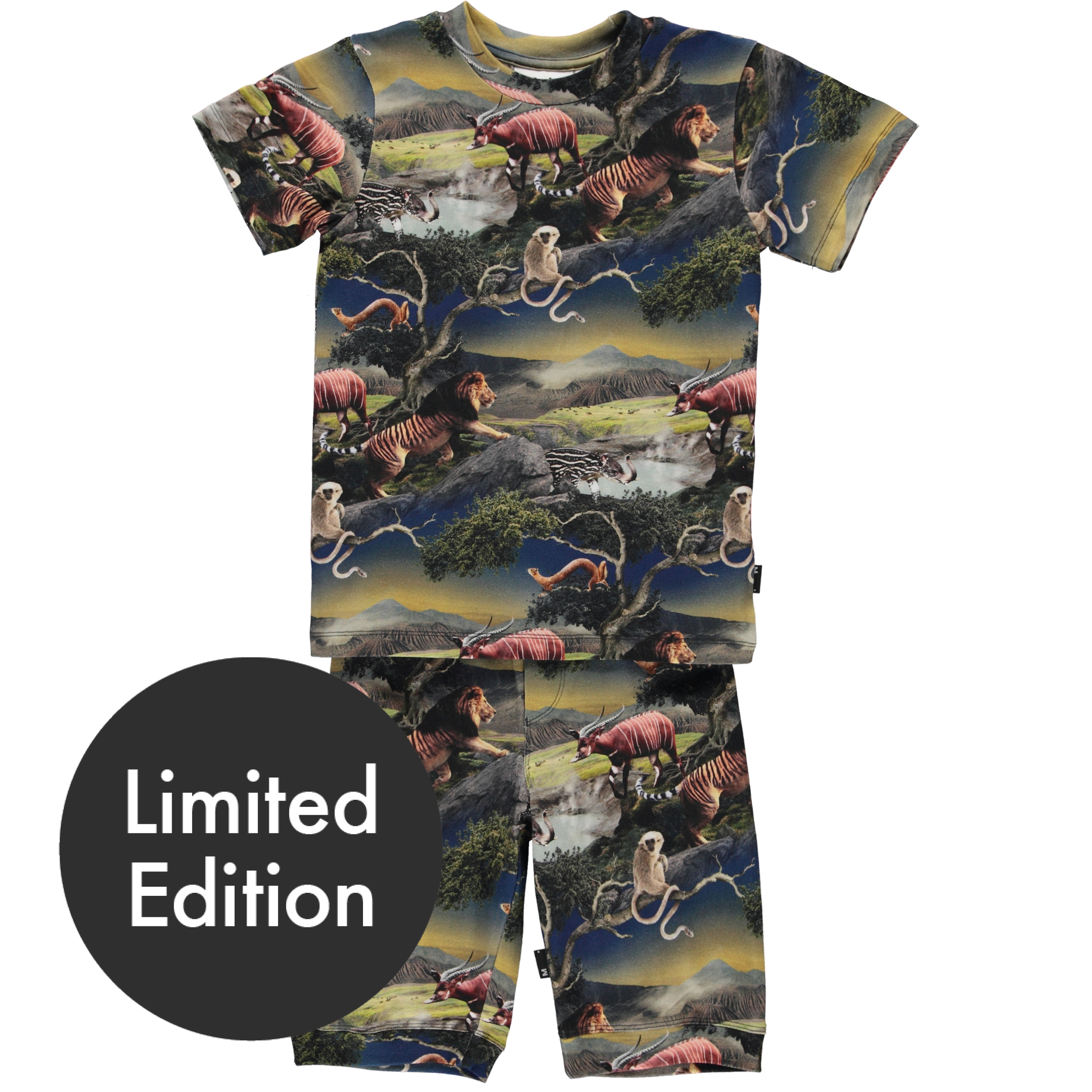 Pyjamas i två delar av mjuk ekologisk bomull med rund halsringning och resår i midjan.