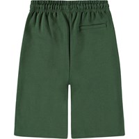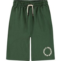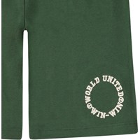 Snygga, mörkgröna basketshorts i ekologisk bomull. Dessa shorts har en lös passform, elastisk midja med snörning, sidofickor och en enda bakficka. Cirkulär brodyr längst ner på ett av benen med texten 'World United Win Win'.