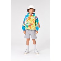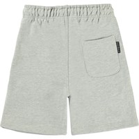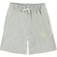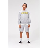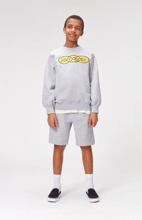 Adian är ett par sweatshorts i en ljusgrå melange med gult "Joyous" broderi på vänster lår och knytband i midjan.