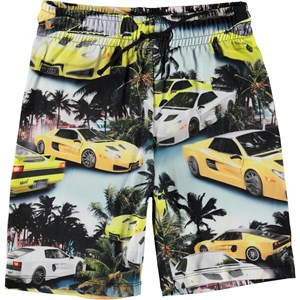 Alim är ett par mjuka och bekväma shorts med tryck av snabba bilar och palmer på en ljusblå bakgrund. Shortsen har elastisk midja med snören.