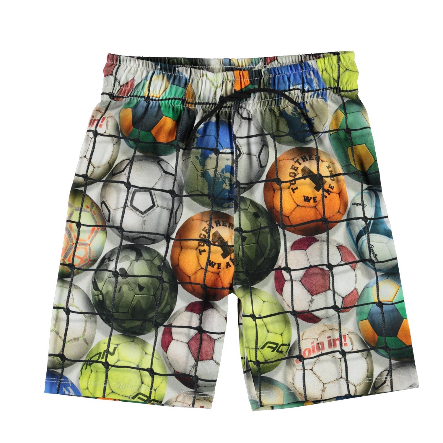 Alim är ett par mjuka och bekväma shorts med tryck av färgglada fotbollar. Shortsen har elastisk midja med snören.