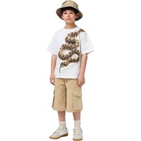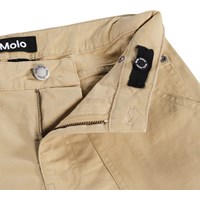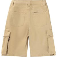 Beige shorts i mjuk bomull med vida ben och stora cargofickor på sidan. Modellen har fram- och bakfickor, hällor och justerbart gummiband i midjan för optimal passform. De minsta storlekarna (92-134) har en praktisk tryckknapp, medan storlekarna 140-176 har en klassisk jeansknapp.
