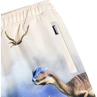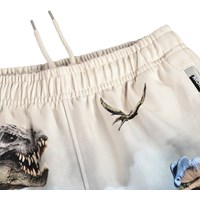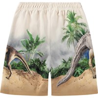 Beige shorts i mjuk ekologisk bomullsjersey med dramatiska dinosaurier i ett djungellandskap. Modellen har en elastisk midja med justerbar dragsko, sidofickor och en lös, avslappnad passform.