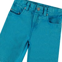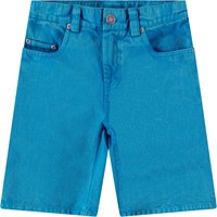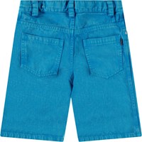 Blå knälånga jeansshorts i ekologisk bomull. Shortsen har fickor fram och bak, en tryckknapp och dragkedja fram, samt bältesöglor. Från storlek 92-134 har shortsen en invändig knapp för att justera midjan och säkerställa en optimal passform och längre användning. Shortsen har en tvättad blå look.