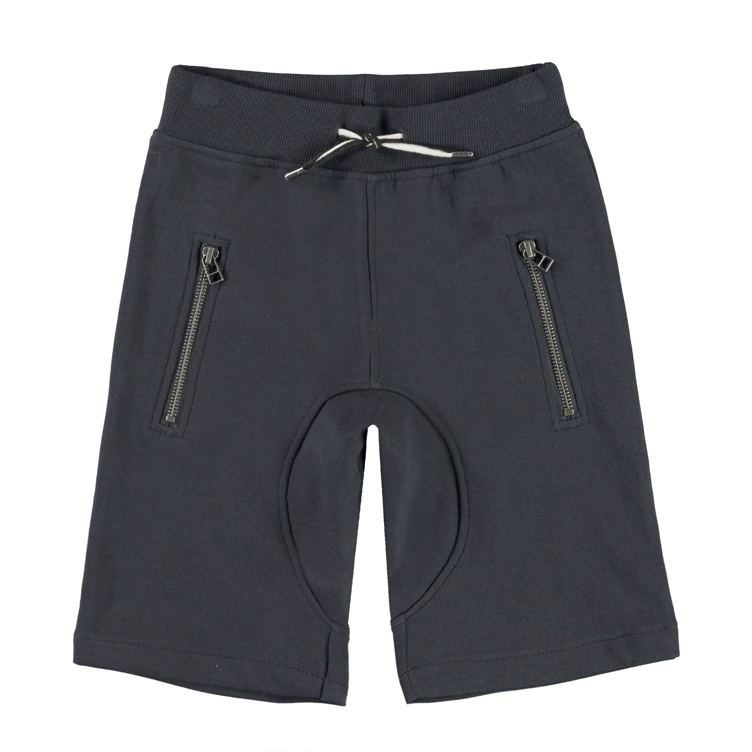 Ashtonshort är ett par mörkblå shorts i ekologisk bomull med en bred ribbad kant i madjan, 2-färgat knytband och fickor med synliga dragkedjor. Ashtonshort har dekorativa sömmar både fram och bak.