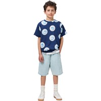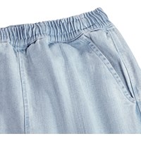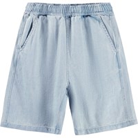 Ljusblå knälånga jeansshorts i mjuk, ekologisk bomull. Shortsen har en elastisk midja, sidofickor, en bakficka och en avslappnad, lös passform.