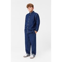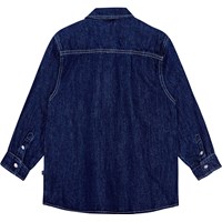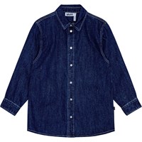 Mörkblå jeansskjorta med långa ärmar, pärlemorsknappar, kontrastsömmar och en normal passform.