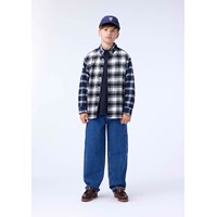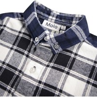 Vit, svart och blårutig skjorta i ekologisk bomull med knappar framtill, button-down-krage, långa ärmar med manschetter, påsydda bröstfickor och en normal passform. Skjortan har två olika typer av rutor. Bär skjortan knäppt eller som en overshirt över en T-shirt.
