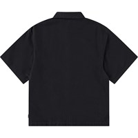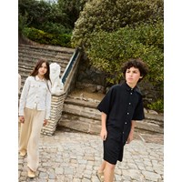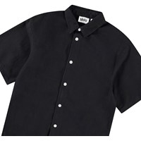 Oversized svart linneskjorta med vida t-shirt-ärmar, klassisk skjortkrage och knäppning framtill.