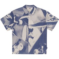 Svart t-shirt skjorta i viskos med 80-tals vibe. Skjortan har en lös passform, långa lösa t-shirt ärmar, vita knappar framtill och en klassisk skjortkrage. Skjortan har ett mönster med neonfärgade flygande vinylskivor. Kombinera med matchande shorts för ett coolt set.