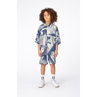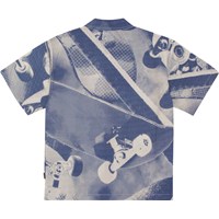 Svart, grå och vit t-shirt skjorta i viskos med 80-tals vibe. Skjortan har en lös passform, långa lösa t-shirt ärmar, vita knappar framtill och en klassisk skjortkrage. Skjortan har ett mönster med inspiration från skatemiljön med skateboards från alla vinklar. Kombinera med matchande shorts för ett coolt set.