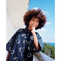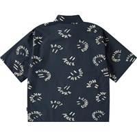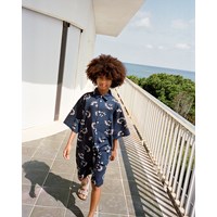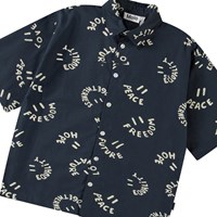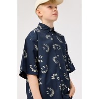 Mörkblå skjorta i mjuk ekologisk bomull med vida t-shirt ärmar, klassisk skjortkrage och knäppning framtill. Skjortan är oversized med beige leende ansikten och glada ord som "mun". Matcha med matchande shorts för en komplett uppsättning.