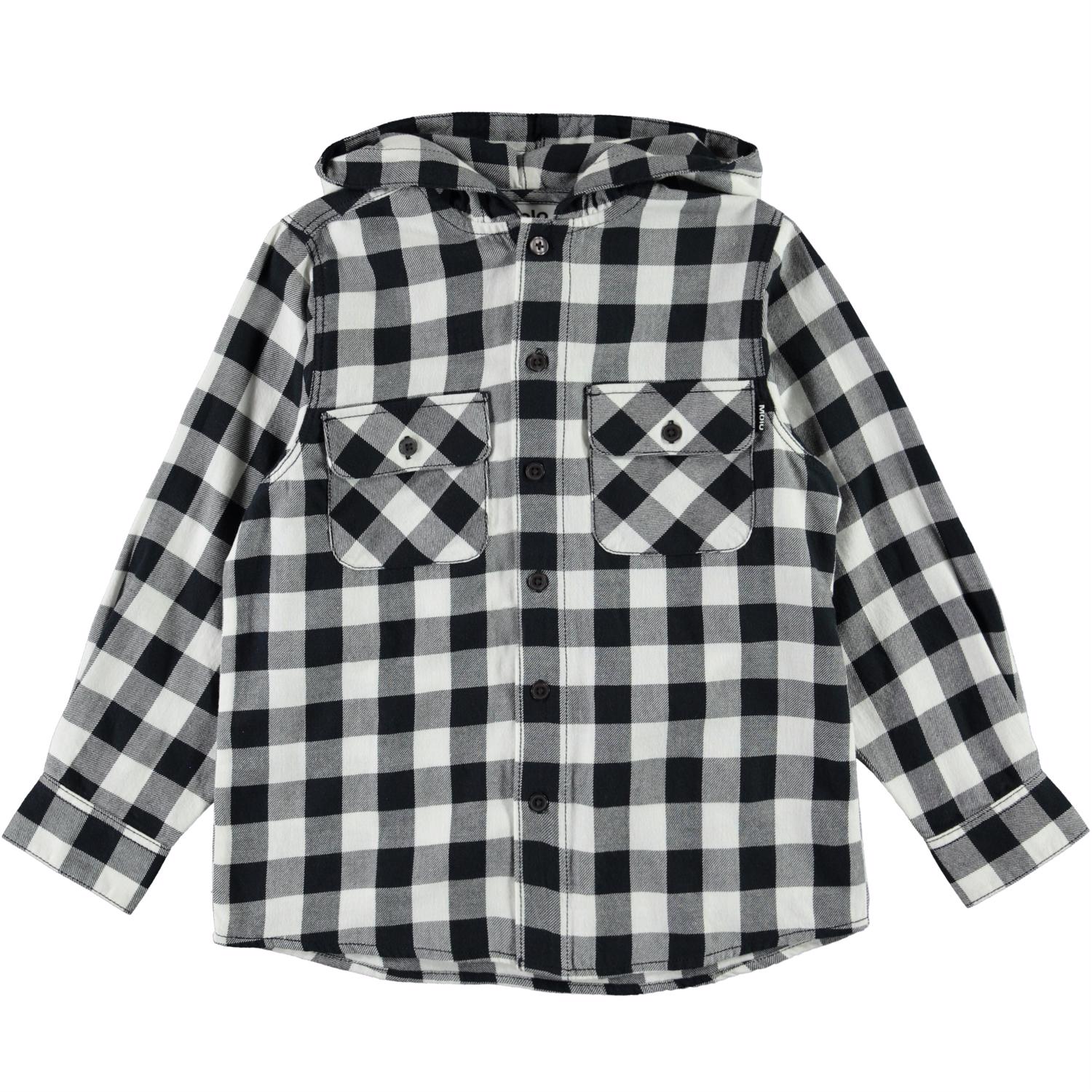 Rizz är en svart, vit och grå rutig skjorta med huva. Skjortan har manschettknappar och fickor framtill.