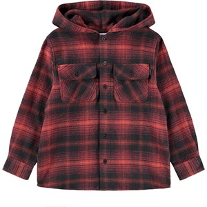 Svart-och rödrutig overshirt i bomull med huva, långa ärmar, svarta knappar, två bröstfickor och en normal passform.