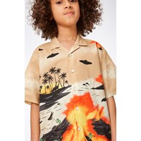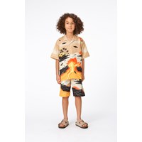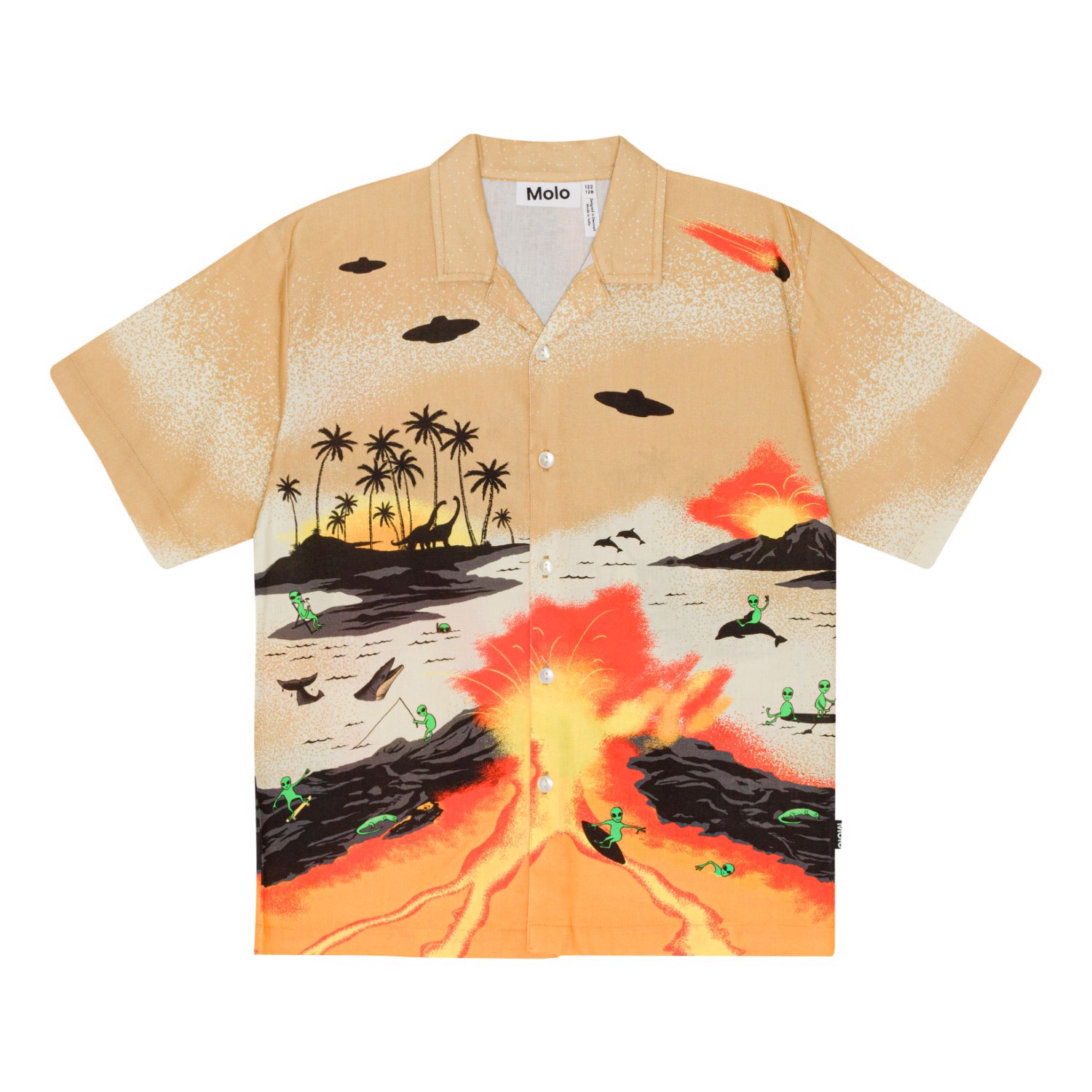 Rui är en kortärmad skjorta med mönster framtill, i 100% ekologisk bomull. Den vänliga alien har tagit med sina vänner i detta brännvarma mönster. De har en fest med olika aktiviteter i ett landskap av palmöar och eldsprutande vulkaner. De små aliens lyser grönt upp på en bakgrund av sandfärger, gul och orange. Denna skjorta har korta ärmar, knappar framtill och en normal passform. För en extra cool look, kombinera den med matchande shorts, Adi, i samma mönster.
