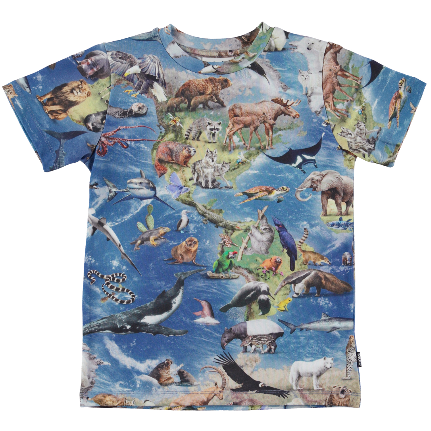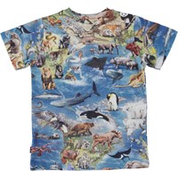 Ralphie är en blå t-shirt med vår jords kontinenter och alla djur, både de som lever i vatten och på land.