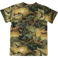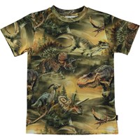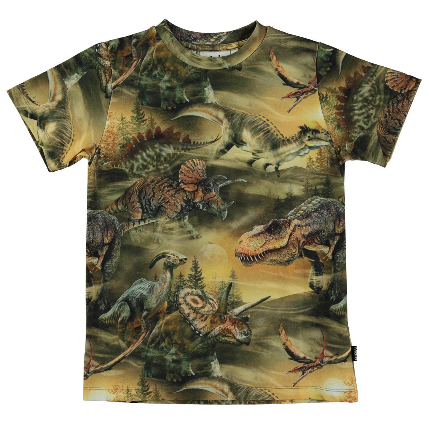 T-shirt med helmönster i gröna och gula nyanser. Här ses många olika dinosaurier som vandrar runt i sanddynorna i morgonens dis. Ovan dem ses ytterkanten av månen, som påminner dem att de är en del av något större. Denna t-shirt är tillverkad i 100% bomull, har korta ärmar, rund hals med ribbkant och normal passform.