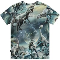 Blå T-shirt i ekologisk bomull med korta ärmar, rund hals och ribbstickad kant. T-shirten har en normal passform och ett mönster med massor av dinosaurier som lever på sin egen planet.