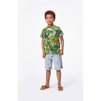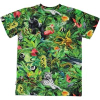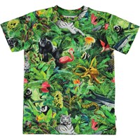 Raphie är en t-shirt med trycket 'Fantasy Jungle', där det finns många djur i djungeln, som vanligtvis inte finns där. Polon har en svart krage med en vit rand.