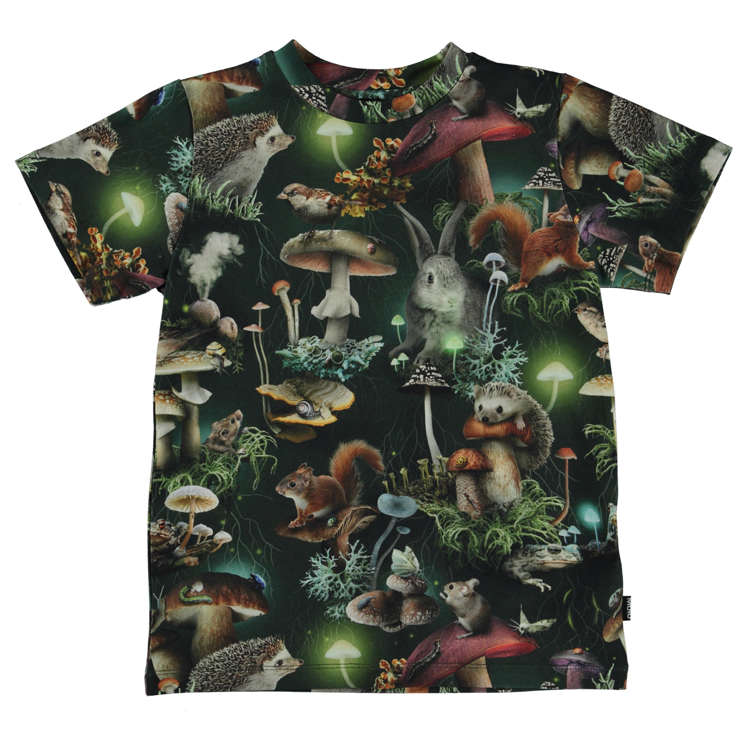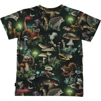 Svart helmönstrad t-shirt med skogens mysiga djur. Små knagare och andra smådjur hoppar runt bland svampar i mörkret som är upplyst av de bioluminösa svamparna. Svamparna lyser upp mörkret i skogens mörker. Denna t-shirt är tillverkad i 100% bomull, har korta ärmar, rund hals med ribbkant och normal passform.