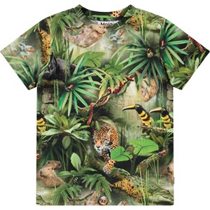 Åtsittande t-shirt i mjuk ekologisk bomull med ribbad halsringning. T-shirten har ett mönster av en frodig grön djungel med många djur.