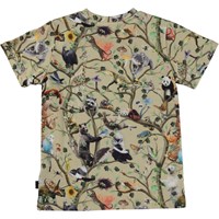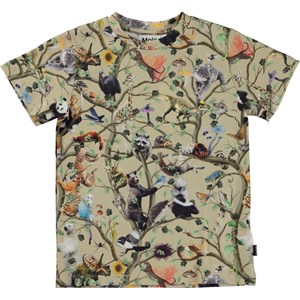 Beige t-shirt med helmönster. Mönstret visar all världens djur i livets träd. De berättar historien om hur vi alla är sammanlänkade. Precis som trädets ränder är svampar, fåglar, ekorrar och björnar, stora som små, sammanlänkade, och vi ska alla vara rädda om varandra. Denna t-shirt är tillverkad i 100% bomull, har korta ärmar, rund hals med ribbkant och normal passform.