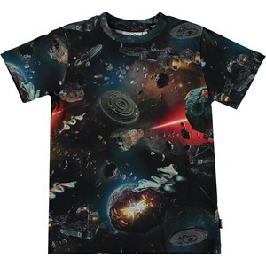Mörk t-shirt med rymdmönster i retrokänsla. Rymden är full av klara, härliga färger och massor av kul. Här följer vi äventyrslystna rymdskepp och UFO´s som jagar nya äventyr bland asteroidbälten. Denna t-shirt är tillverkad i 100% bomull, har korta ärmar, rund hals med ribbkant och normal passform.