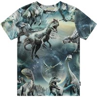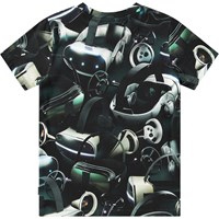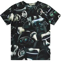 Mörk T-shirt i ekologisk bomull med korta ärmar, rund hals och ribbad kant. T-shirten har en normal passform och ett mönster inspirerat av virtuell verklighet, särskilt VR-glasögon, som kan transportera dig till en helt annan värld.