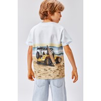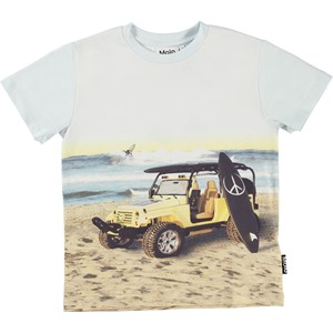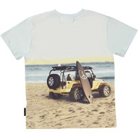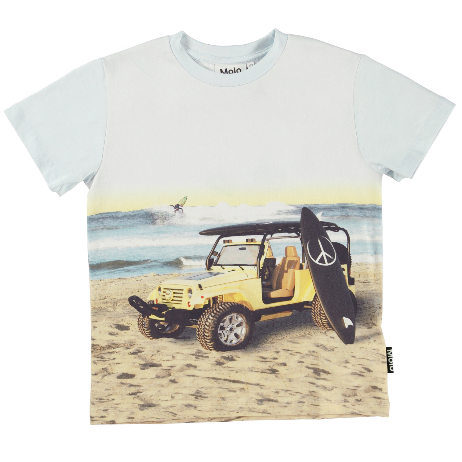 Rame är en ljusblå t-shirt med en jeep parkerad på stranden med en surfbräda, medan havet brusar i bakgrunden.
