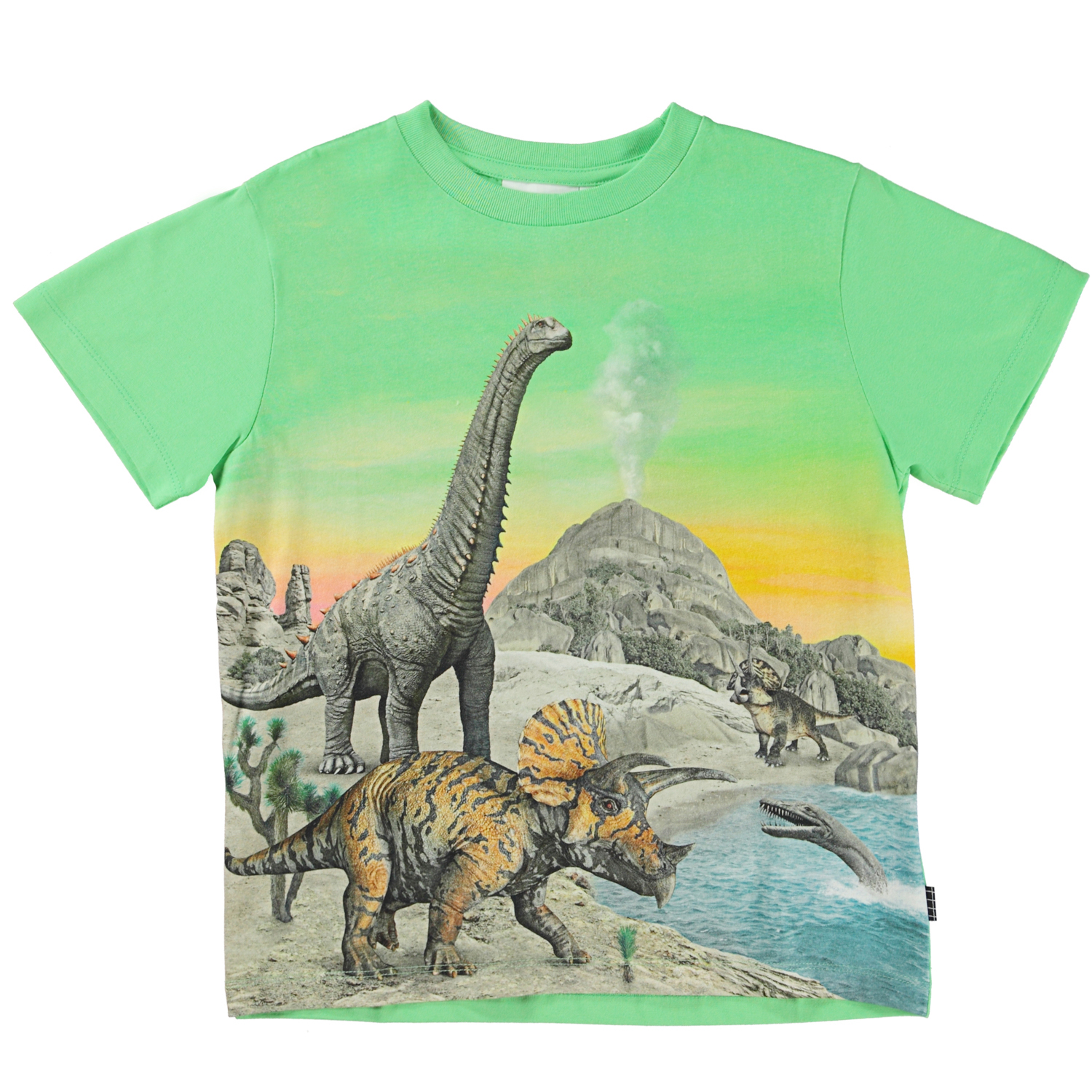 Rame, i mönstret "Colourful Dinos", är en t-shirt i ekologisk bomull med en dinosaurie framtill. Himlen öven den är kraftigt grön, precis som baksidan av t-shirten.