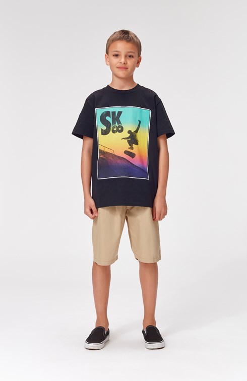 Rame är en svar T-shirt där en skater åker på en skateboard framför en regnbåge.