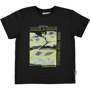 Rame är en svart t-shirt med tryck av snabba bilar på framsidan samt texten ”Take a ride, see the world”.