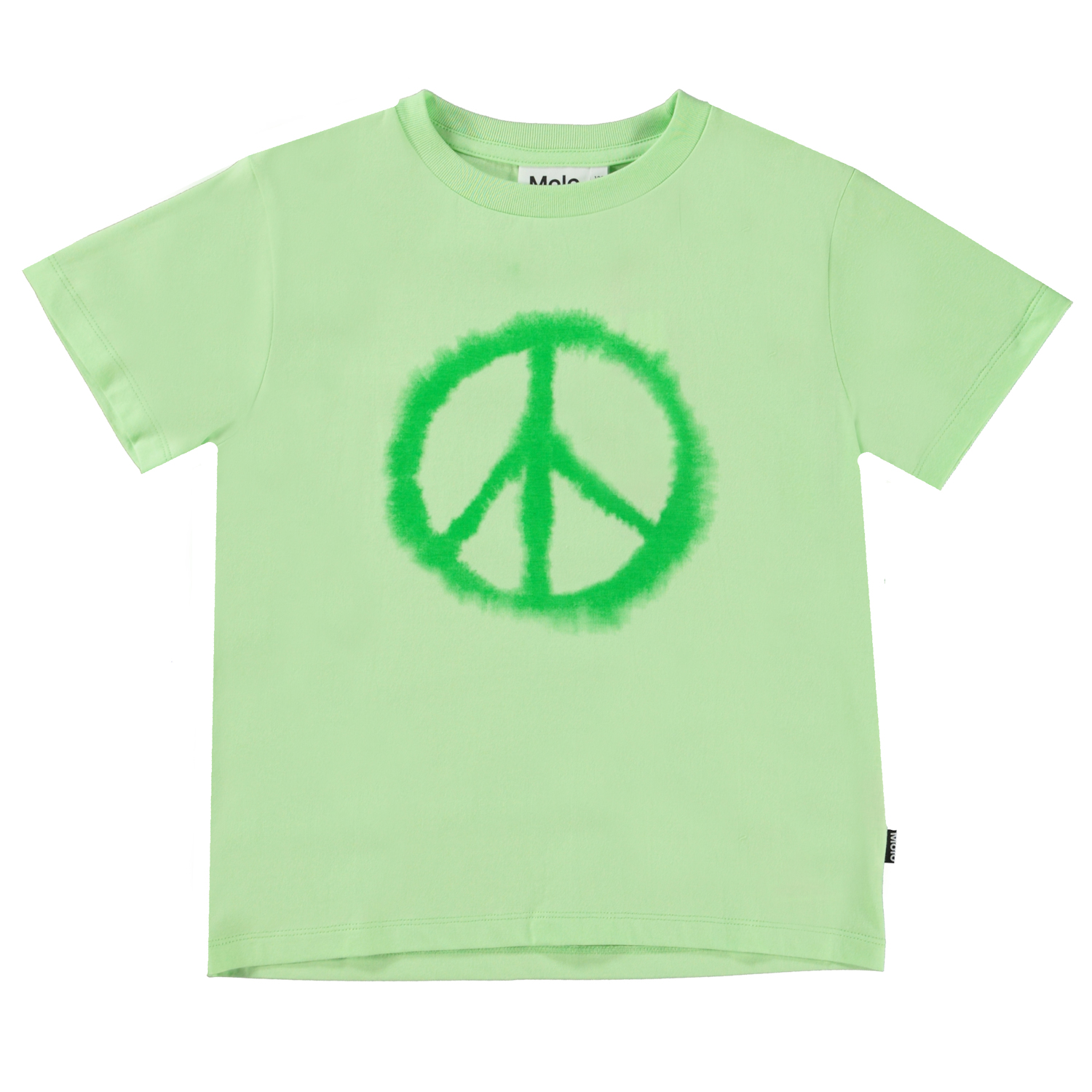 Grön t-shirt i 100% ekologisk bomull medett akvarellmplat peacetecken. T.shirten har rund hals med ribbkant och normal passform.