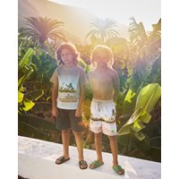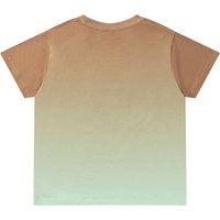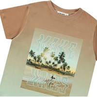 Brun och ljusgrön T-shirt i ekologisk bomull med korta ärmar och ribbad halsringning. T-shirten har en lös passform och ett mönster av en strand, palmträd och texten 'Make Waves'.
