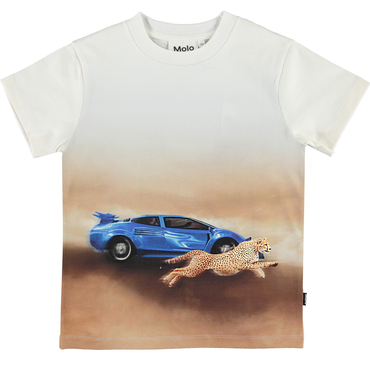 Rame är en vit T-shirt med mönstret "Car Race Cheetah". För vem är egentligen snabbast, racerbilen eller geparden?