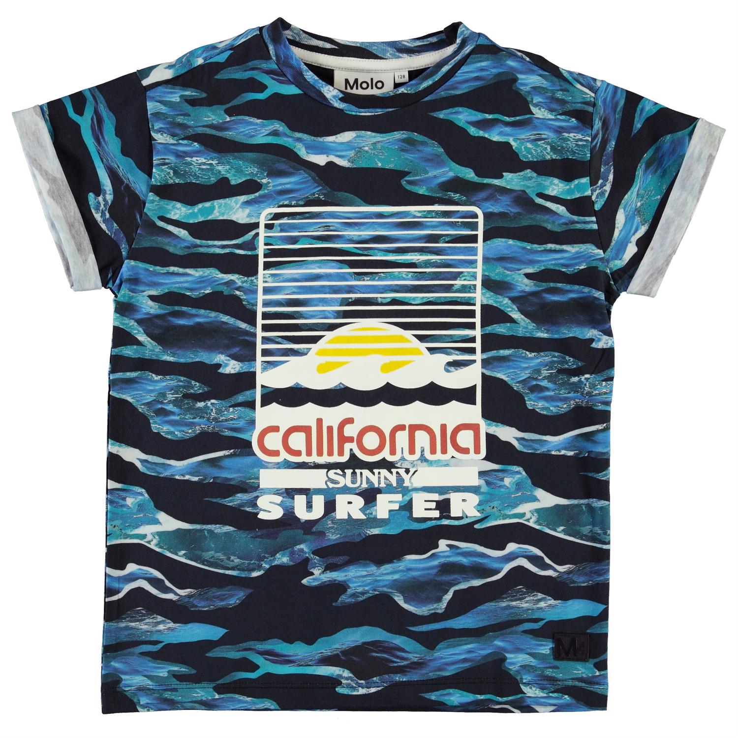Randon är en blå t-shirt med ett tryck av vågor som ser ut som kamouflage. T-shirten har ett retro ”california”-tryck framtill och uppvikta ärmar. T-shirten är i 100% bomull.