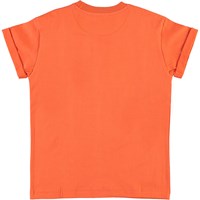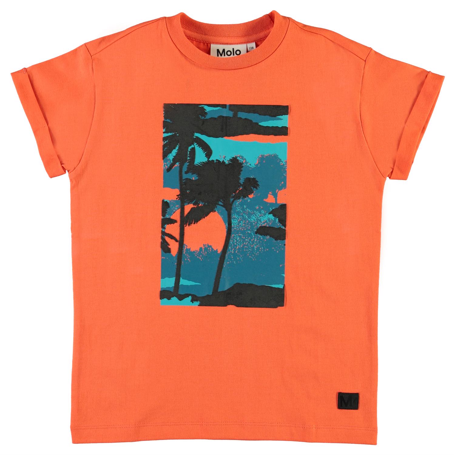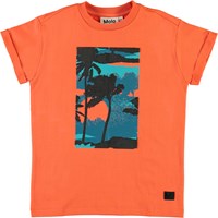 Randon är en korallröd t-shirt med tryck av palmer och solnedgång framtill. T-shirten är i 100% bomull och har uppvikta ärmar.