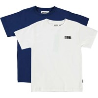 Rasmus är Molo´s populära basic t-shirt i vit, med logotryck på den vänstra sidan. Här är t-shirten i ett 2-pack som innehåller en mörkblå och en vit.