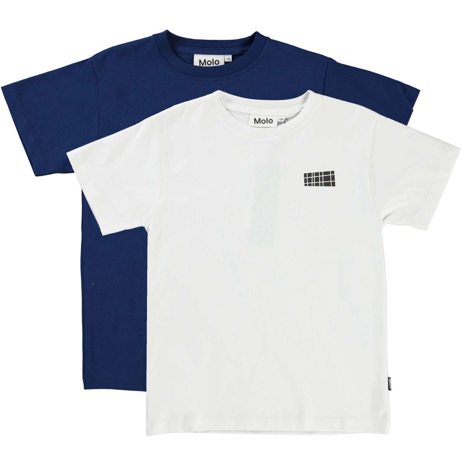 Rasmus är Molo´s populära basic t-shirt i vit, med logotryck på den vänstra sidan. Här är t-shirten i ett 2-pack som innehåller en mörkblå och en vit.