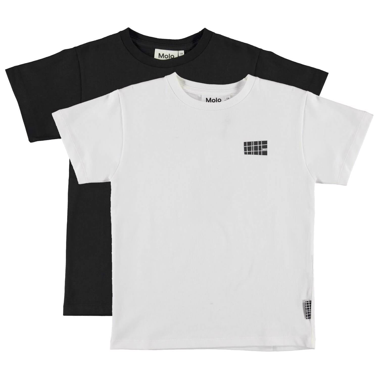 Rasmus är Molo´s populära basic t-shirt i vit, med logotryck på den vänstra sidan. Här är t-shirten i ett 2-pack som innehåller en svart och en vit.
