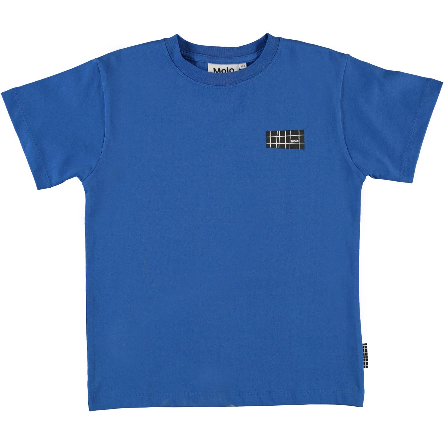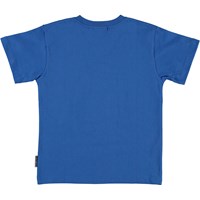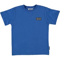 Rasmus är en blå t-shirt med korta ärmar och en logga på vänster sida.