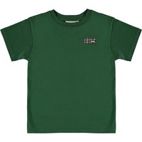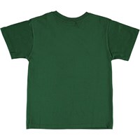 Rasmus är en grön t-shirt med korta ärmar och en logga på vänster sida.