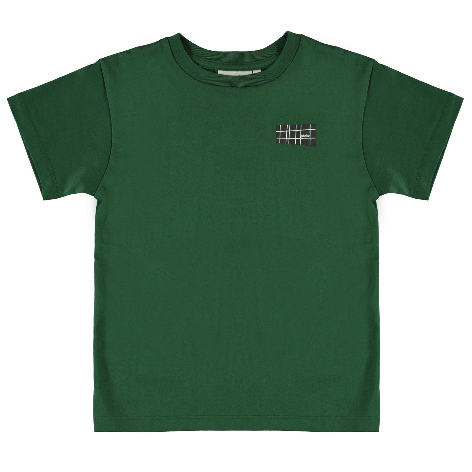 Rasmus är en grön t-shirt med korta ärmar och en logga på vänster sida.