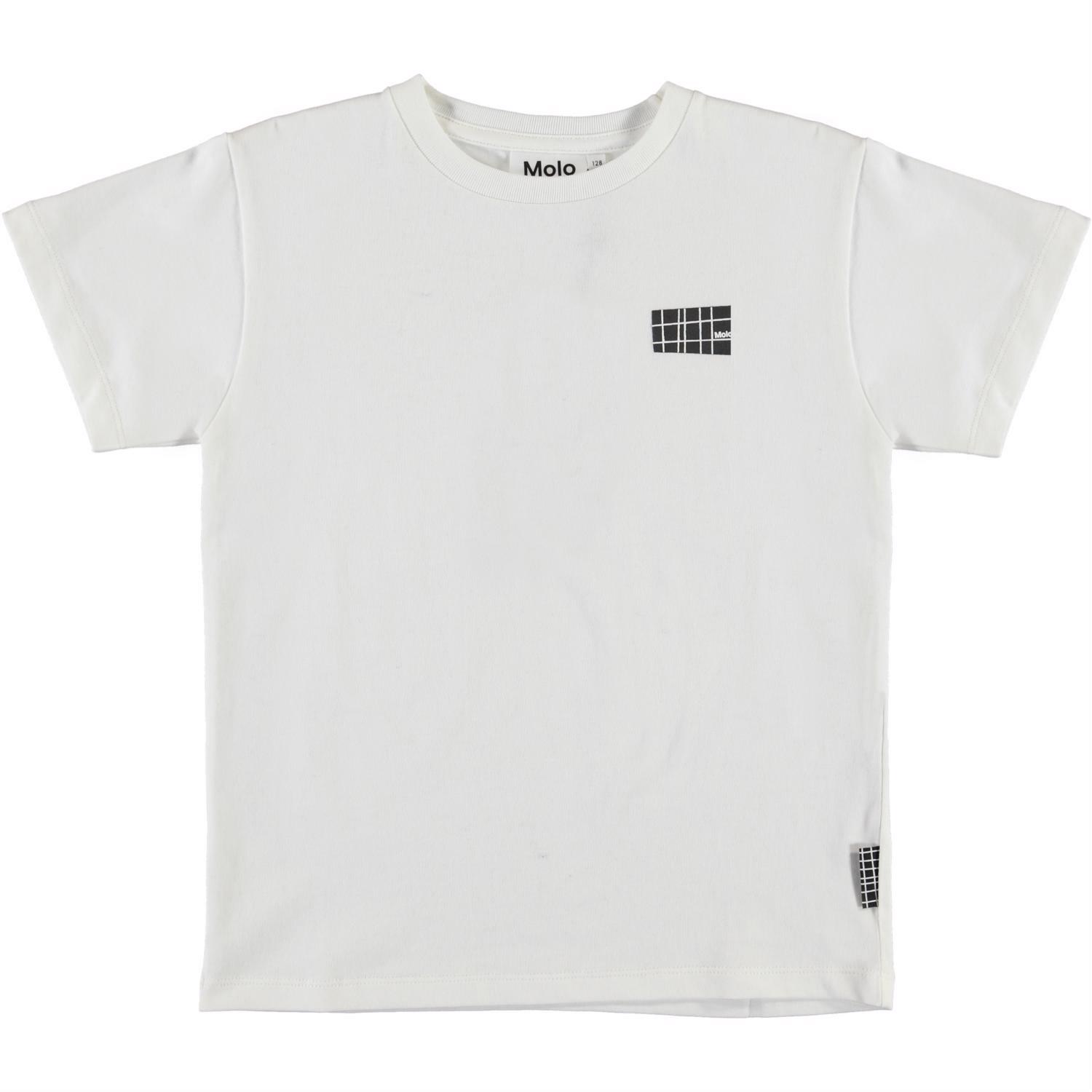 Rasmus är en vit t-shirt med korta ärmar och en logga på vänster sida.