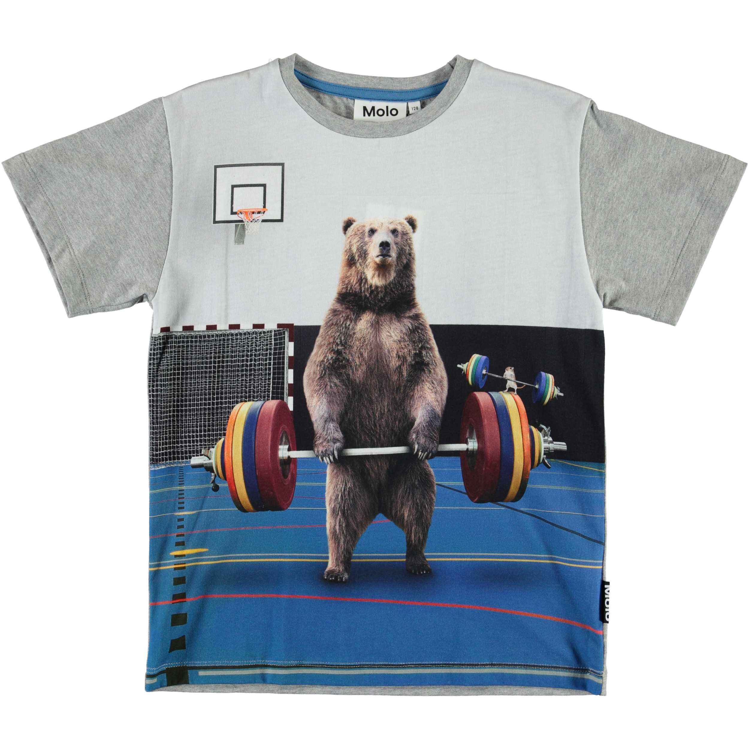 Björnen och musen lyfter tunga tyngder på t-shirten Rasmus. Rasmus är en grå t-shirt med korta ärmar.