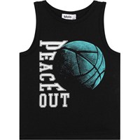 Rave är ett svart linne, tillverkat i 100% ekologisk bomull. Rave har en rund hals med ribbkant, en lös passform och mönster framtill. Här ses en grafisk turkos basketboll, där linjerna på bollen formar ett peacetecken och texten skickar ett budskap om "Peace Out" i vitt.