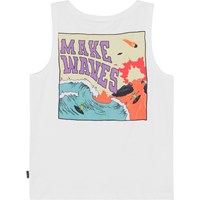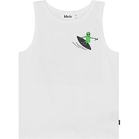 Rave är ett vitt linne, tillverkat i 100% ekologisk bomull. Rave har en rund hals med ribbkant, en lös passform och mönster framtill. Här ses en liten alien på en surfbräda och på baksidan kan man se hur de kommit till jorden för att ha det kul och "Make Waves".